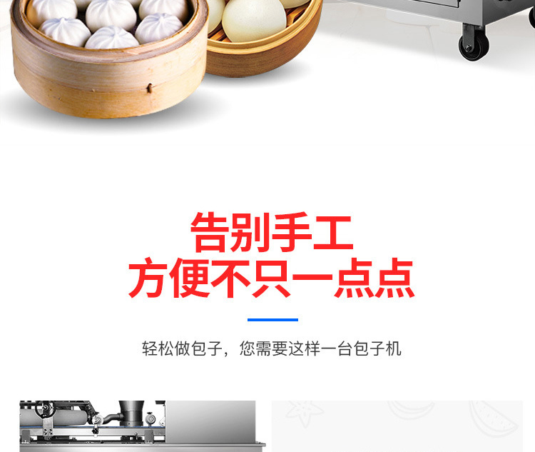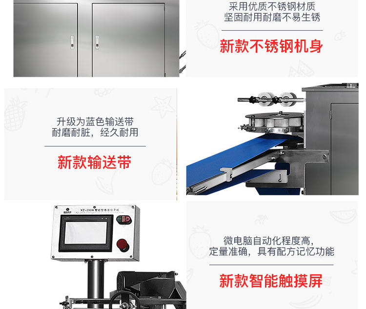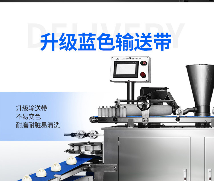 XZ-290A智能型卷面式包子機(jī)是一款以壓面方式成型面皮,卷面方式包餡,仿手工捏花的一款機(jī)型,它整合了原有的二道壓面、成型機(jī)、出餡機(jī)、切刀為一體,有操作方便、占地面積小等優(yōu)點(diǎn)。該機(jī)采用壓面成型面皮的方式,表面光潔,不傷面筋,不發(fā)熱,使產(chǎn)品口感滑順?biāo)冢3謧鹘y(tǒng)手工工藝的風(fēng)味,本機(jī)采用自動(dòng)控制系統(tǒng),品質(zhì)穩(wěn)定,壓面滾筒采用性能好的食品級材料UPE加工而成,且增大了滾簡直徑使得在壓面過程中面皮的精度更高,產(chǎn)品重量精度更高,規(guī)格,長度,大小,面皮的厚度皆可調(diào)整設(shè)定。