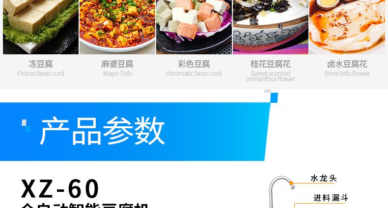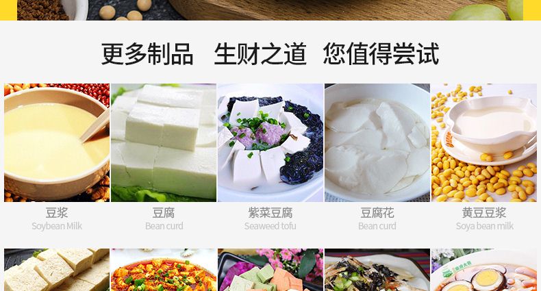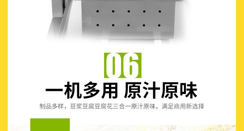 全自動(dòng)豆腐機(jī)系列,一機(jī)多用:可生產(chǎn)豆腐系列產(chǎn)品:單色(嫩,老)豆腐、多彩豆 腐、單色豆腐皮、多色豆腐皮、彩色豆腐干、豆?jié){、豆花等豆制品制作,還可以與其他設(shè)備和工藝配套生 產(chǎn)更多的豆制品。