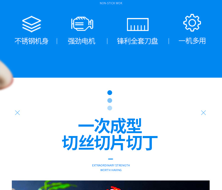 1、一機(jī)多用,根莖類蔬菜,并可切片、絲、條、丁、段等。