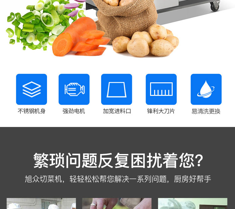 旭眾多功能切菜機是根據(jù)多種進口機在實地使用中存在不足之處,反復改進設計制造,采用不銹鋼和全滾動軸承結(jié)構(gòu),具有外形美觀,成熟可靠,使用維修方便等特點。適用蔬菜脫水、速凍、保鮮、腌漬等食品行業(yè)各類蔬菜。可切蔬菜:
