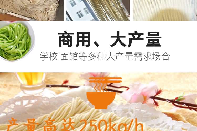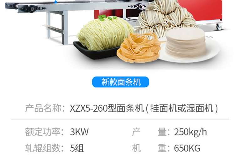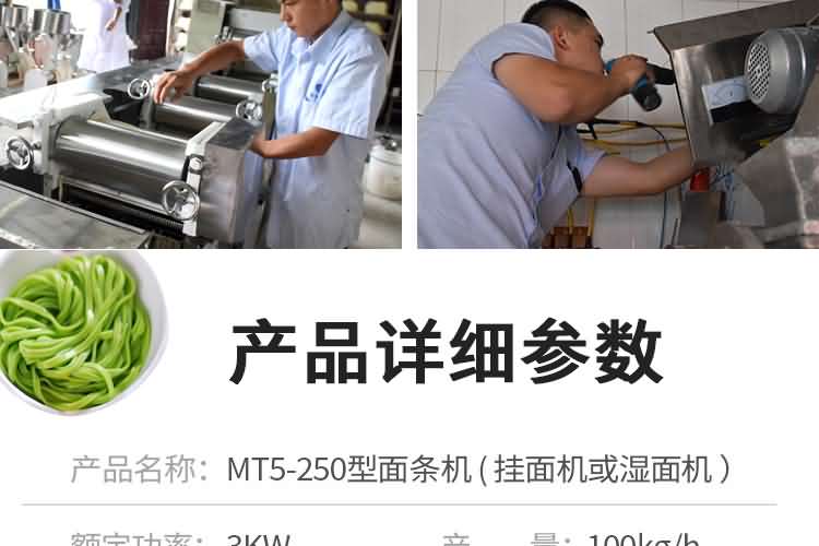 MT5-250面條機 (掛面機或濕面機) | 外形尺寸:2300×600×1400mm 產(chǎn)量:200kg/h 軋輥:98×260mm 功率:3kw 軋輥組數(shù):5組 機重:450kg | 鐵外殼 |
