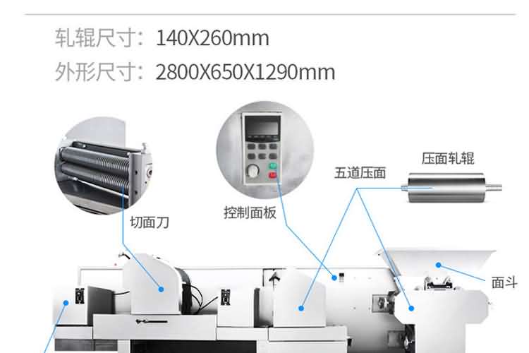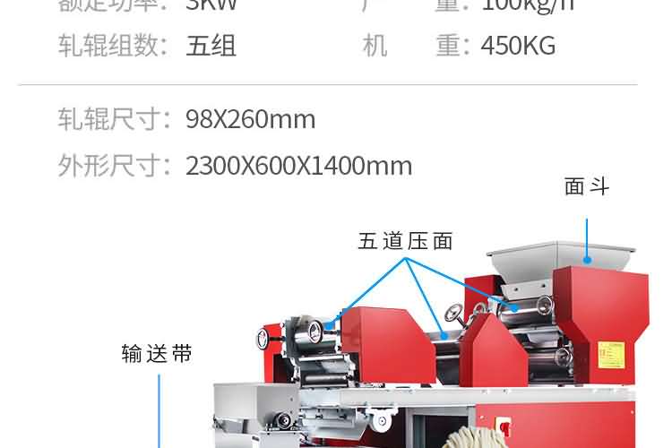 MT5-280面條機 (掛面機或濕面機) | 外形尺寸:2300×620×1400mm 產(chǎn)量:230kg/h 軋輥:98×300mm 功率:3kw 軋輥組數(shù):5組 機重:500kg | 鐵外殼 |