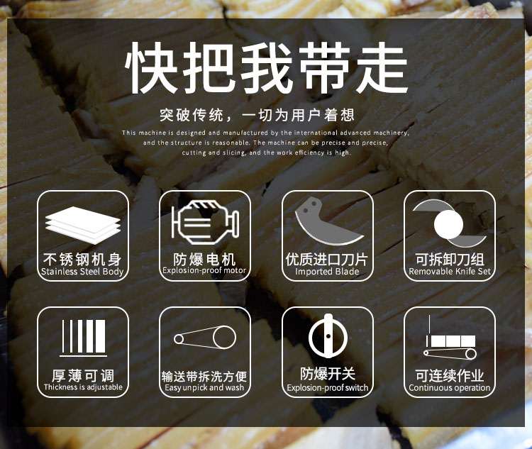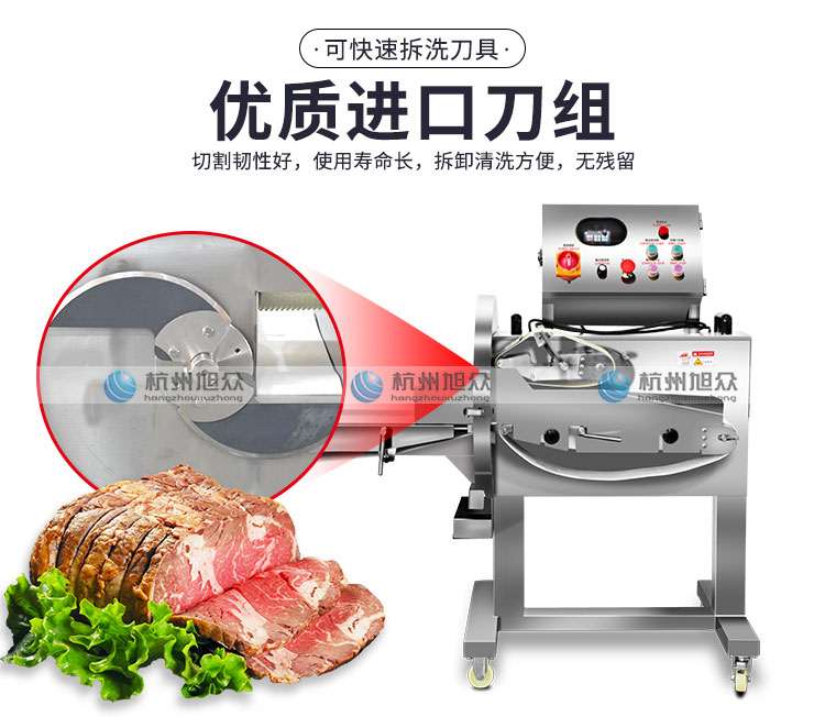 l 特制法國進口刀片,鋒利持久,二把刀片切割原理,能將叉燒肉、臘肉、五花肉、牛肉、鹵味、熟肉類以及一些根莖類蘿卜,土豆,黃瓜,蓮藕,辣椒,苦瓜,絲瓜,西葫蘆等切成片形狀;