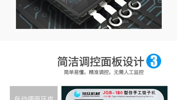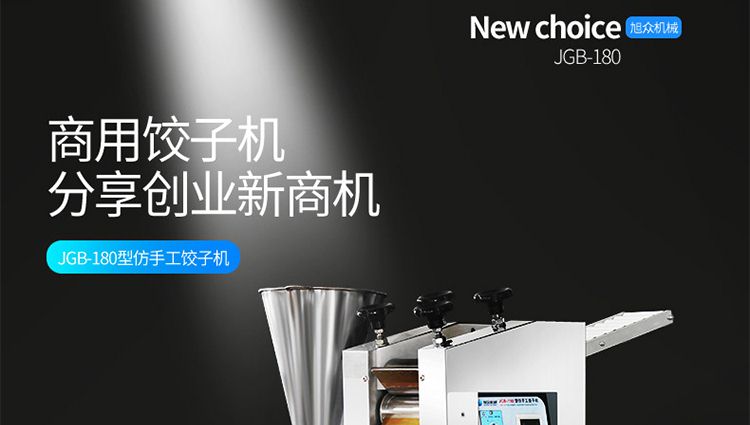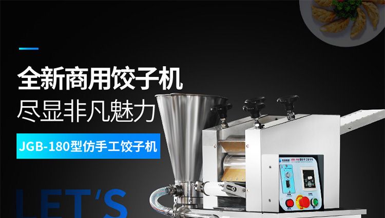 JGB-180仿手工餃子機,先進的自動餃子生產設備,包括主動壓皮部分、自動供餡部分、自動包合部分、自動成品輸送部分,并且只要更換模具,就可制鍋貼等食品。適合食品速凍廠、飯店、廠礦學校食堂等制作包餡面制品單位使用。