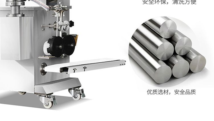 ?本機采用自動軋制面皮后包制餃子的新工藝技術,克服了舊式餃子機絞龍強力擠壓,使面團面粉發(fā)熱、糊化、面制變硬、面胚失去筋度,而造成的餃子口感發(fā)硬,面皮較厚的缺陷。