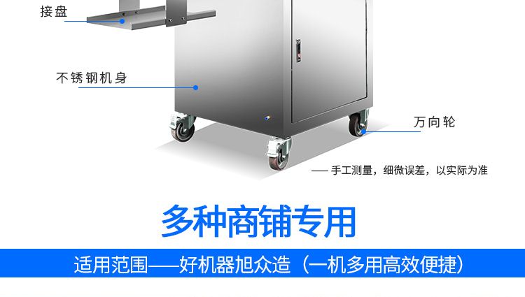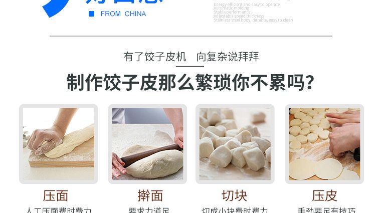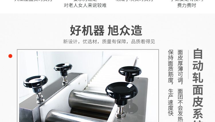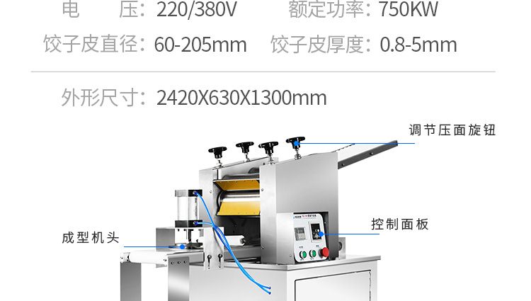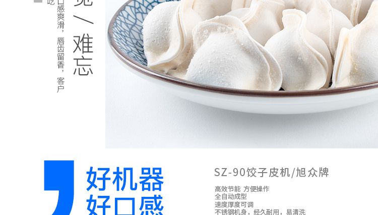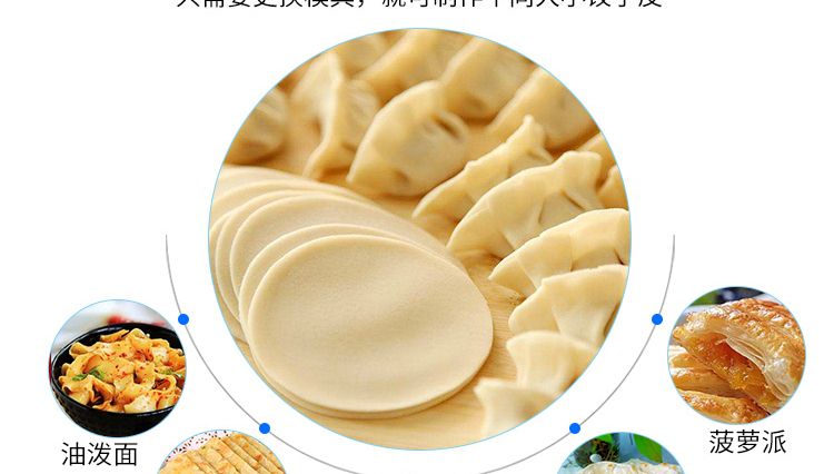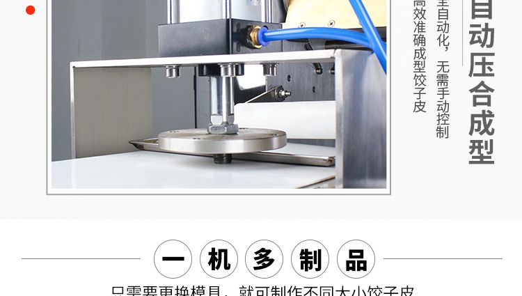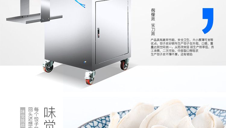 JGB-90型餃子皮機是我公司開發(fā)生產的先進餃子皮生產設備??梢院唵胃鼡Q模具(可根據客戶定制不同形狀、尺寸的模具),本設備采用氣缸運動。本廠生產的90餃子皮機,采用多道壓面輥壓面,壓面效果優(yōu)異,壓出的面皮筋道,進一步提高所包出的餃子口感。
