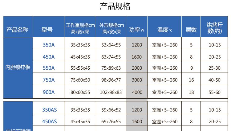 產(chǎn)品名稱 | 型號 | 工作室規(guī)格cm | 外型規(guī)格mm | 電壓 | 功率 | 溫度 | 層數(shù)/斤(約) |