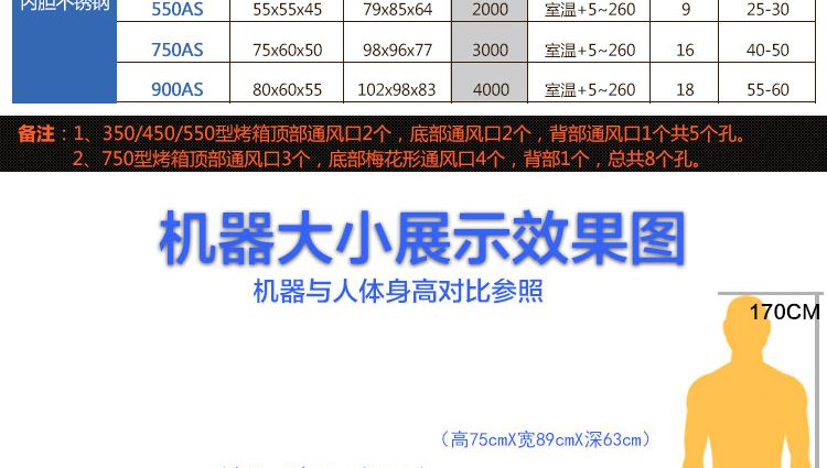 注:1、350/450/550型烤箱頂部通風(fēng)口2個,底部通風(fēng)口2個,背部通風(fēng)口1個共5個孔
