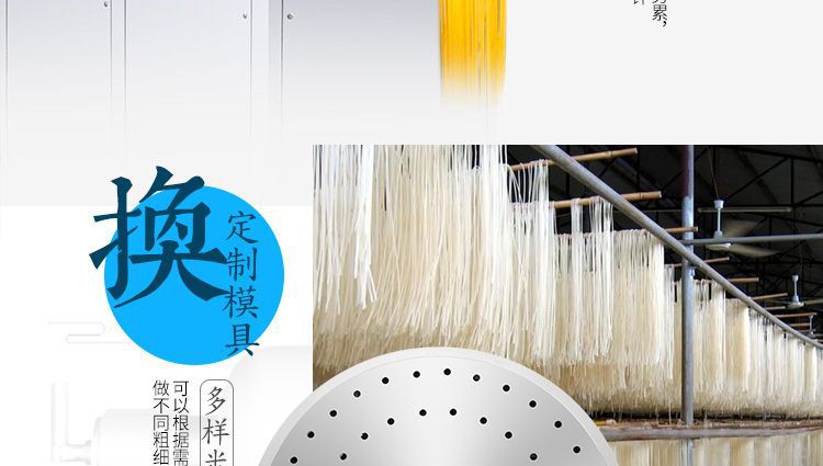 改進型米粉、米線專用機,裝有自動溫空裝置,整個生產(chǎn)過程設備均在恒溫狀態(tài)下運行,自動化程度高,操作簡單,l人即可生產(chǎn)??缮a(chǎn)米粉、米線、桂林米粉、過橋米線、年糕等產(chǎn)品。各種形狀都可生產(chǎn)(圓、扁),加工食品外表光滑,厚薄、寬窄、粗細均勻可調(diào),筋軟適度,有彈性,口感柔軟、味道純正。