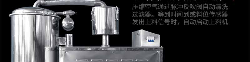 真空上料機(jī)由真空泵(無油、無水)、不銹鋼吸料咀、輸送軟管、PE過濾器(或316L不銹鋼過濾器)、壓縮空氣反吹裝置、氣動放料門裝置、真空料斗和料位自動控制裝置等組成,整套系統(tǒng)設(shè)計(jì)合理、制造精美。