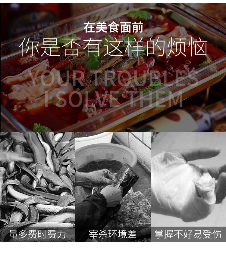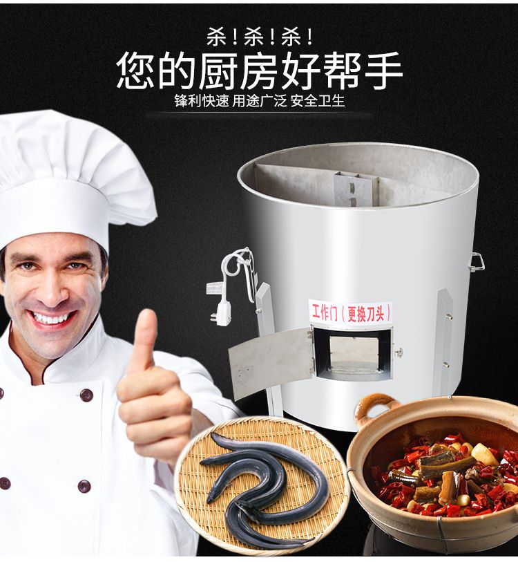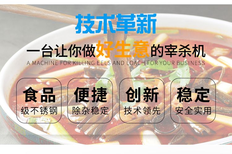 鱔魚泥鰍宰殺機是我廠根據(jù)市場需求,自行研發(fā)設計的,專業(yè)宰殺鱔魚、泥鰍的通用型機電設備,具有工作效率高,能耗低,故障率低,經(jīng)久耐用,操作安全方便,外形美觀大方等特點。填補了市面上黃鱔泥鰍宰殺設備的空白,是一款不錯的投資產(chǎn)品,可廣泛應用于菜市場、食堂、食品加工廠、酒店等場所。