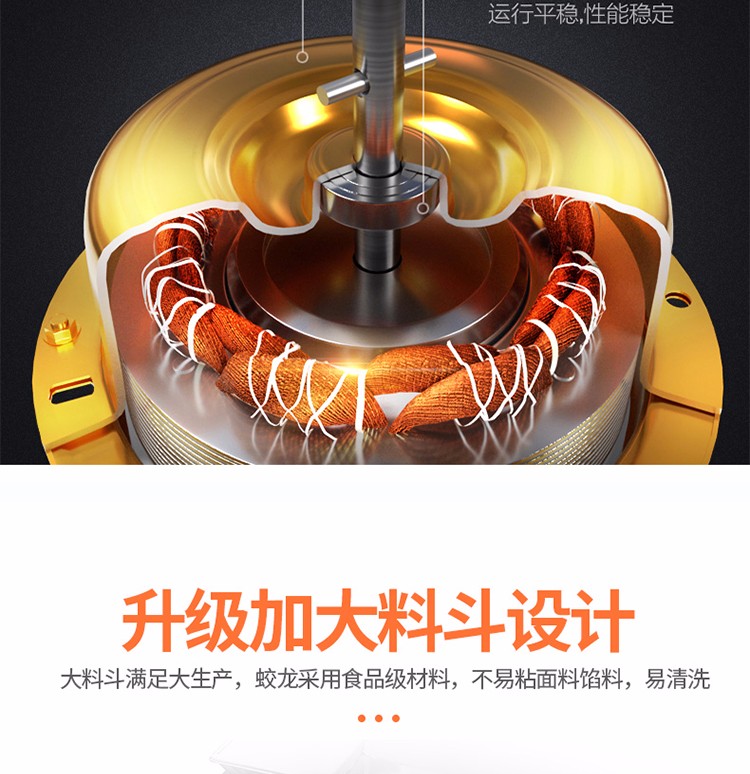 5.料斗加大,蛟龍采用高品質(zhì)食品級(jí)PP材料,不粘面料、餡料,易清洗;