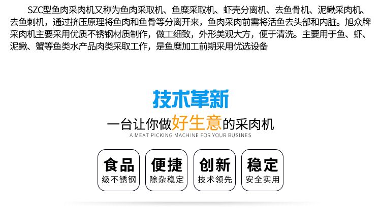 旭眾XZC系類魚肉采肉機是一款專業(yè)加工魚肉去刺、蟹蝦去殼的機械,由于隨著市場的發(fā)展,人們生活中漸漸離不開有魚的生活,無論是家里、飯店等魚都是主要的食物還有現在一些休閑食品中都是離不開魚加工后的魚泥。魚肉采肉機的研制成功給人們生活中帶來很多方便,無論是您做魚丸、魚餡等只需要一款魚肉采肉機就可以實現,對于大量生產即降低了人工成本,又提高了生產效率。