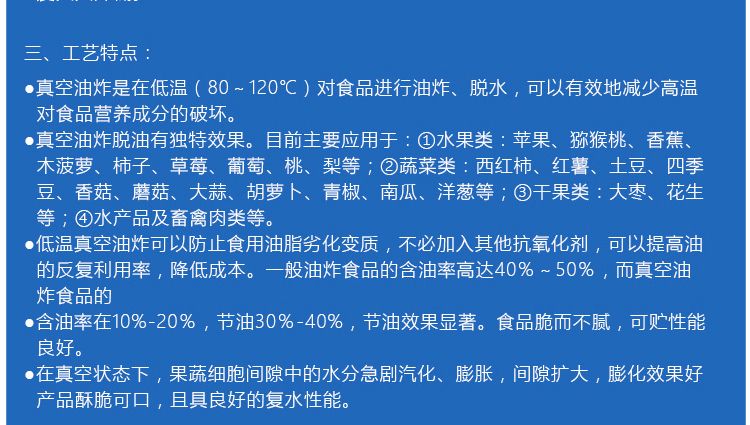 ●真空油炸是在低溫(80~120℃)對食品進行油炸、脫水,可以有效地降低高溫對食品營養(yǎng)成分的破壞。